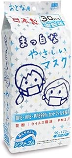 【ビホウマスク 安心の日本製 使い捨て不織布マスク フリーサイズ 耳が痛くならない平ゴム・ソフト生地仕様 軽い着け心地 花粉・ウイルス・飛沫防止】 おとな用まっ白なやさしいマスク(個包装) 30枚入