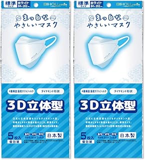 【ビホウマスク 安心の日本製 4層構造 国産高機能フィルタをダブル使用! 口元に3D空間を作り呼吸がしやすく肌との摩擦を防ぐ最新立体型マスク 清潔なホワイトタイプ】3D立体型 まっ白なやさしいマスク 標準サイズ 5枚入 2袋セット