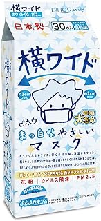【ビホウマスク 安心の日本製 使い捨て不織布マスク ゆったり大きめサイズ 耳が痛くならない平ゴム・ソフト生地仕様 軽い着け心地 花粉・ウイルス・飛沫防止】横ワイドまっ白なやさしいマスク(個包装)30枚入