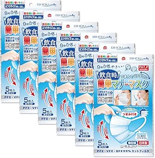 【ビホウマスク 安心の日本製 AG抗菌加工不織布 使い捨て食事用マスク 耳にやさしいふわふわ太ゴム・ソフト生地仕様 花粉・ウイルス・飛沫・PM2.5防止】 簡単マナーマスク ふつうサイズ ホワイト(個包装) 5枚入 6袋セット