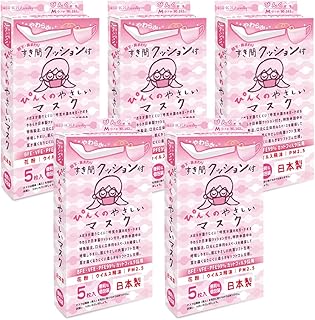 【ビホウマスク 安心の日本製 使い捨て不織布マスク 女性用サイズ 耳が痛くならないやわらかな耳ゴム・肌にやさしい内面ソフト生地仕様 花粉・ウイルス・ほこり・飛沫防止 メガネが曇りにくい! 】すき間クッション付きぴんくのやさしいマスク (個包装) 5枚入 5箱セット